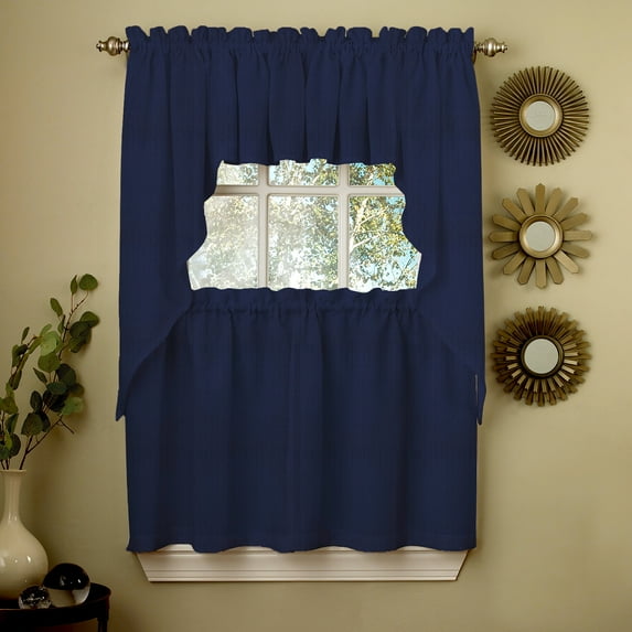 $1294current price $12.94Mainstays 3-Piece Textured Semi Sheer Rod Pocket Kitchen Window Tier Pair and Valance, 2 Café Curtains and 1 Curtain Valance, Navy, 56"W x 36"L