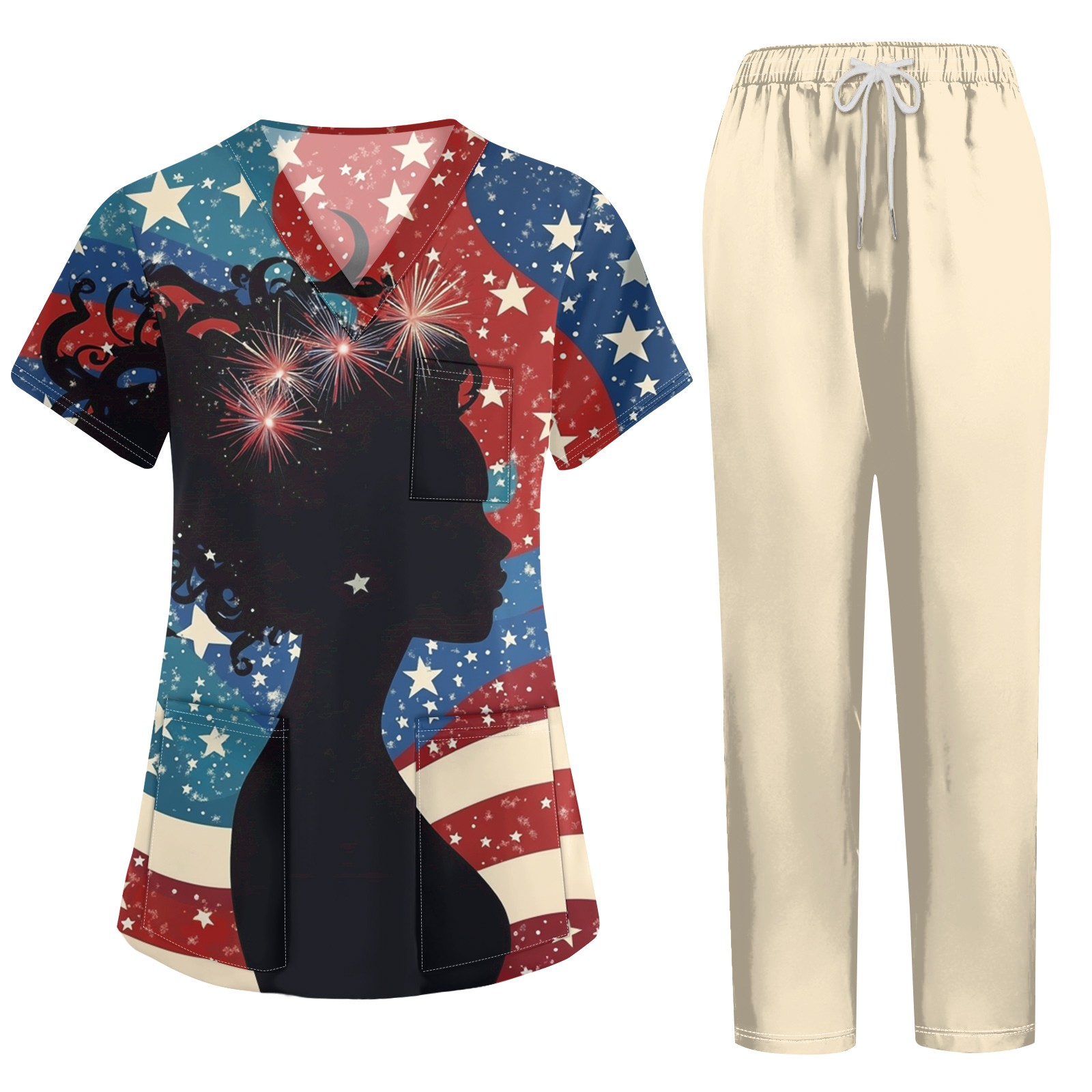 Hero image 0 of LHVUOA Independence Day Scrubs Medical Uniform Women Scrubs Set Stars Stripes Print Scrubs Top and Pants, 0 of 7