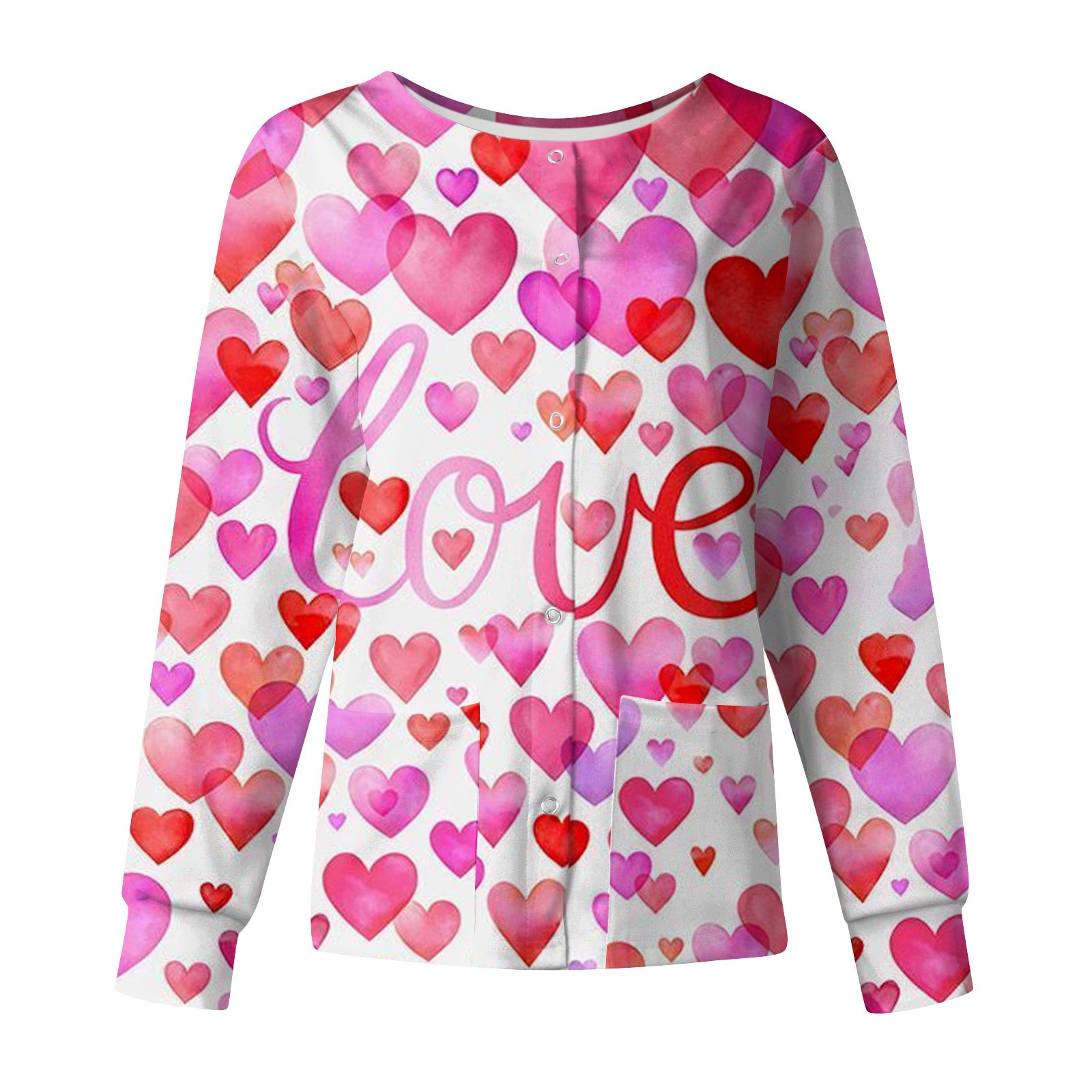 LHVUOA Scrub Jacket for Women Valentine Day Print Long Sleeve Snap Front Valentine Love Printed Nursing Uniform Shirts with Pockets