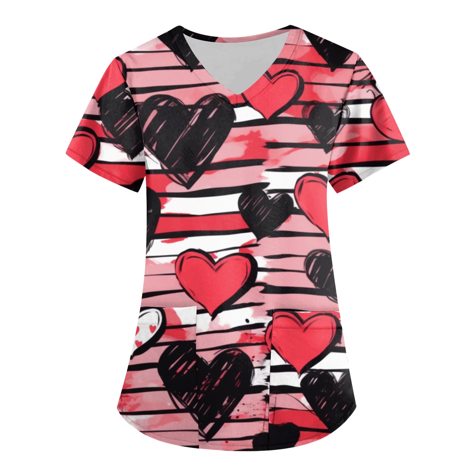 LHVUOA Valentine's Day Scrub Tops for Women Plus Size Short Sleeve Working Uniform Stretch Nursing Medical Scrubs T Shirts with Pockets