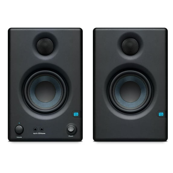 The PreSonus 2-Way 3.5-inch near field studio monitor (PAIR) is ideal for gaming and home video production. The Eris E3.5 employs the same technology as the larger Eris models to deliver studio-quality sound, with a smooth and accurate frequency response. Yet they're compact enough to fit almost anywhere. Kevlar woofers deliver a cleaner overall sound every Eris-series studio monitor utilizes a custom-woven kevlar low-frequency driver. The weave and nature of the Eris E3.5s 3.5-inch kevlar woofer result in a more constant dispersion pattern throughout the frequency range, resulting in less time-smeared audio and cleaner overall sound. Smooth high end and wide sweet spot the Eris e3.5 is equipped with a one-inch silk-dome tweeter that produces a smooth and refined sound, accurately reproducing transients and high frequencies. The tweeter is designed to radiate sound with a fairly wide dispersion pattern, creating a large optimal listening area or sweet spot so you can move around and still hear everything accurately. Easy-to-use controls a speakers response is affected by where you place it and the acoustics of your space. That's why Eris E3.5 active media reference monitors offer easy-to-adjust high- and low-frequency controls. A convenient front-panel volume knob sets both the speaker level and the integrated headphone amplifier level. Becareful with that volume knob, though: Eris E3.5s are driven by an onboard 25 watt, side power amplifier and can get a lot louder than you may expect, while still delivering clear, accurate audio. Connect to virtually any line-level source with three different types of audio inputs, its easy to feed audio to your Eris monitors from a mixer, an interface, a media player, or almost any other line-level source. The Eris E3.5 is equipped with rear-panel, ¼-inch TRS and RCA inputs, as well as front-panel ⅛-inch stereo, unbalanced line inputs for use with mobile audio devices. With this selection, youll have no problem hooking your Eris speakers up with virtually any line-level source, including your smartphone or tablet. The loud, clear, front-panel headphone amplifier lets you work and play in stealth mode, without disturbing your housemates. Accuracy defined like all PreSonus monitor speakers, the Eris E3.5 offers consistent, accurate listening, with the smooth and even frequency response that has made Eris monitors popular around the world. Their compact and powerful design makes them an ideal solution for any small space. Features components and construction 3.5-inch (89 mm) Kevlar low-frequency transducer 1-inch (25 mm), ultra-low-mass, silk-dome, high-frequency transducer Rear-firing acoustic port for superior bass-frequency reproduction optimized, resonance-suppressing internal bracing User controls High- and low-frequency tuning controls front-panel volume control for speakers and headphone amplifier Power and safety 50 watt (25W/side), Class AB biamplification RF interference, output current limiting, over-temperature, transient, and subsonic protection Amplifier soft start feature eliminates popping on power-up Internal power supply with IEC connector Power switch with on/off LED Inputs and outputs balanced ¼-inch TRS, unbalanced 1/8-inch stereo, and RCA inputs integrated stereo headphone amplifier with front-panel 1/8-inch output.