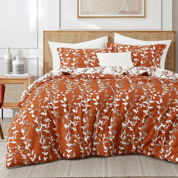 Lanco 3 Piece Terracotta Comforter Set, Full Size Solid Microfiber Print Bedding Set, All Season Leaves Bedding