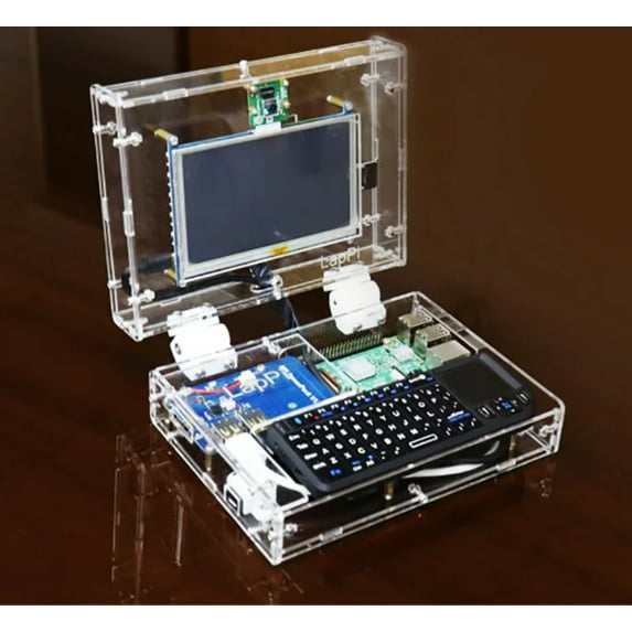 - It comes with a 5" LCD touchscreen, a wireless keyboard with touch-pad, an 8Ω 5W speaker set, an acrylic sheet case, Li-Ion rechargeable power bank, and Raspberry Pi (any variant can be used).