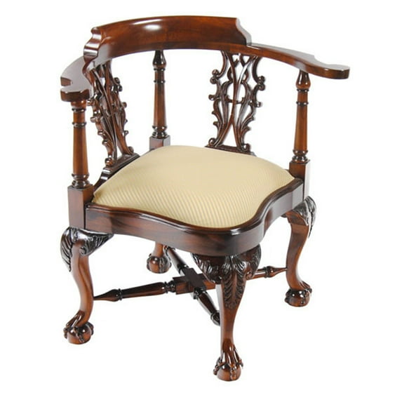 A high quality, hand carved, solid mahogany Large Corner Chair as created by Niagara Furniture. Our Large Corner Chair features hand carved acanthus leaves on the knees and scrollwork in the back splat all executed by hand using traditional methods in solid mahogany. Standing on four cabriole legs with carved ball and claw feet in the Chippendale style the cross stretcher base will help the item remain solid for decades to come. Chair ships with a drop in seat covered in our most popular upholstery, this can be easily removed to replace the upholstery to suit your needs.