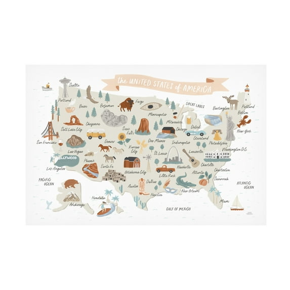 This ready to hang, gallery-wrapped art piece features a depiction of a US map with tourist destinations. Prominent Colors: White, Tan, Light Blue, Grey Giclee (jee-clay) is an advanced printmaking process for creating high quality fine art reproductions. The attainable excellence that Giclee printmaking affords makes the reproduction virtually indistinguishable from the original piece. The result is wide acceptance of Giclee by galleries, museums, and private collectors. Gallery wrap is a method of stretching an artist's canvas so that the canvas wraps around the sides and is secured a hidden, wooden frame. This method of stretching and preparing a canvas allows for a frameless presentation of the finished painting.