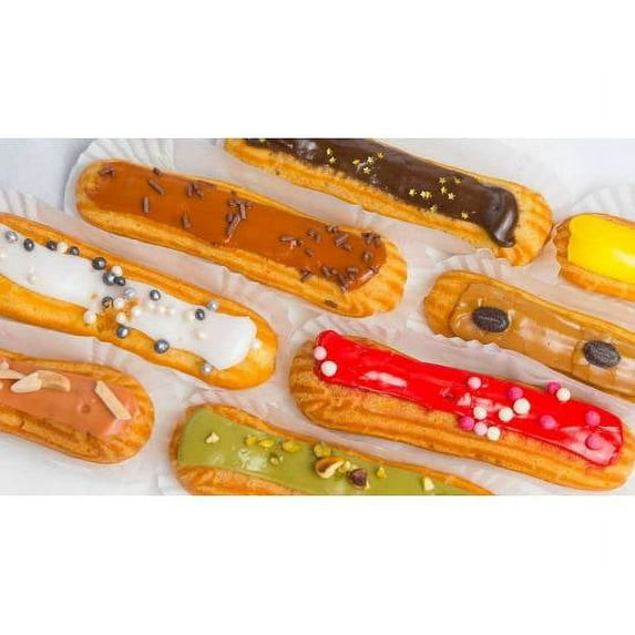 French eclairs are a classic French pastry that is beloved around the world. They are traditionally made with choux pastry dough filled with creamy custard and pastry cream. Each eclair has a delicious cream filling such as pistachio or vanilla that will surprise and delight you!