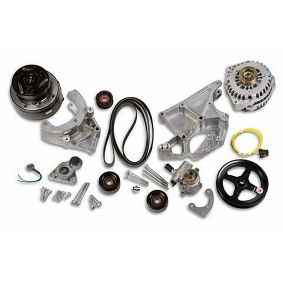 - Included Hardware: Specific items included are a 6V serpentine belt, 59mm grooved idler pulley, LS accessory drive bracket kit, LS power steering pump pulley, LS tensioner assembly, and a 2.75" smooth idler pulley.