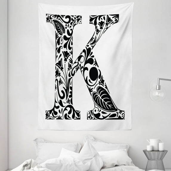 Hero image 0 of Letter K Tapestry, Nature Inspired Figures Black Silhouettes Swirls Abstract Rural Field Pattern, Wall Hanging for Bedroom Living Room Dorm Decor, 60W X 80L Inches, Black White, by Ambesonne, 0 of 2