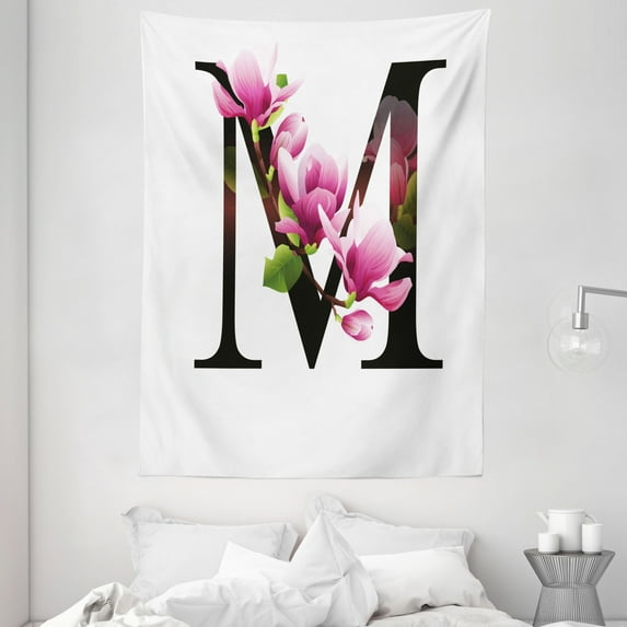 Hero image 0 of Letter M Tapestry, Magnolia Florets Dignity and Nobility Expressing Flowers in Alphabet Design, Wall Hanging for Bedroom Living Room Dorm Decor, 60W X 80L Inches, Pink Green Black, by Ambesonne, 0 of 2