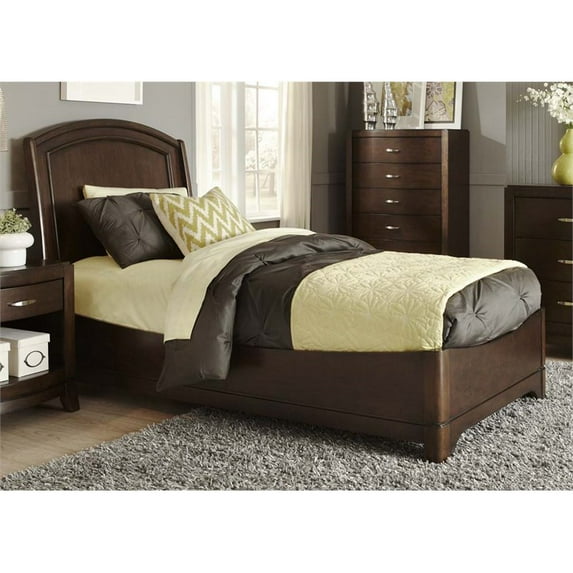 Contemporary elements with Clean Lines and soft shapes. Shaped bow fronts with step tops on the cases give this group an edgy look. Finished in a dark truffle and accented by black PU leather wrapped bar pull hardware with satin nickel trim.Finish: Dark Truffle; Style: Contemporary; Materials: Poplar and Pine Solids with Cherry Veneers; French & English Dovetail Construction; Box Spring Required. Specifications:Overall Product Dimensions: 50" H x 41.88" W x 83.88" D; Overall Product Weight: 102 lbs.