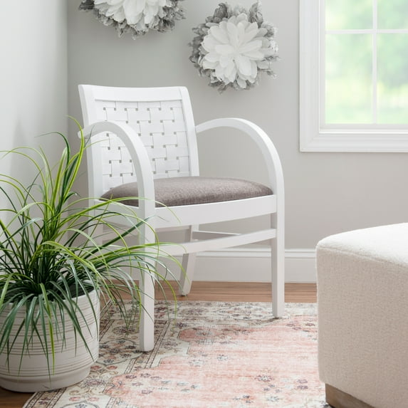 Reminiscent of classic woven strap armchairs, this Linon Rheims Lounge Chair adds a modern touch with beautifully curved arms and clean lines. It easily finds a home in a living room, bedroom, or the like. Crafted from solid beechwood finished in a bright white, the accent chair offers plenty of comforts. Its seat is upholstered in dark gray woven polyester, which is easy to clean, and blends with nearly any color scheme.