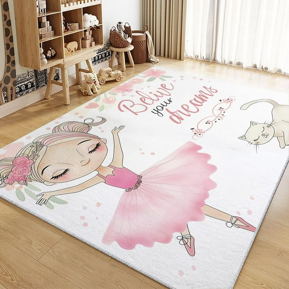 Living Room Area Rugs, Cartoon Pink Ballerina Printed Rug, White Carpet Washable Short Pile Area Rugs For Bedroom Dining Room, Soft Non Slip Non Shedding Rug