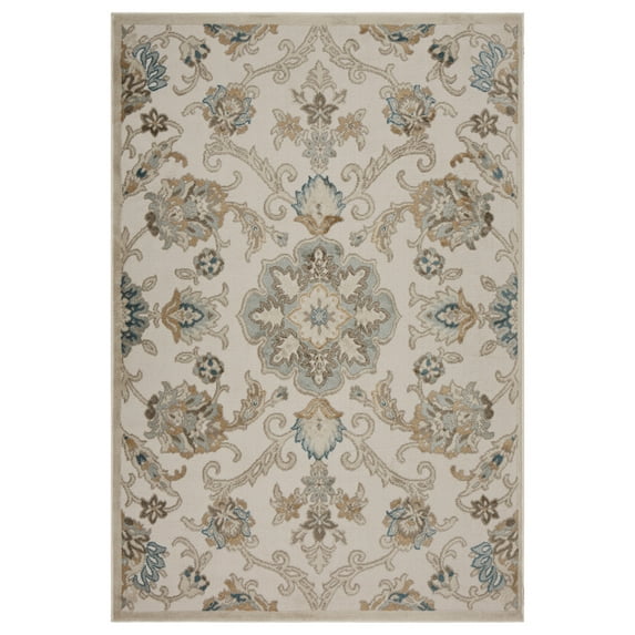 Tranquillity Cream Fungi/Light Blue Rectangle 3 ft. 6 in. x 5 ft. 6 in. Indoor Area Rug Olefin Machine Made Traditional Transitional Victorian Jacobean Oriental Floral Au Fait Indoor Area Rug. Inspired by the gentle tones of nature reminiscent of a breezy beach on a cloudy day, this Tranquillity area rug by LR Resources will bring peace and serenity to any space. This fanciful piece features a modernized jacobean pattern in light teal, brown, beige, and Cream. The muted colors are complimented by the multi-textural nature of the rug, allowing this modern interpretation of the traditional pattern to stand out. Machine Made of 100% olefin on a jute and latex backing, it is fantastically soft and naturally durable.