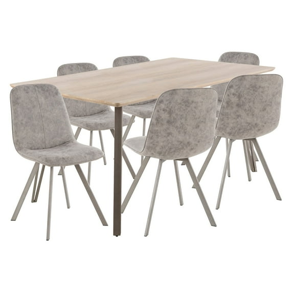 Bring that final touch to your eating space with the Sedona Dining Set by LumiSource! This set includes a dining table and six dining chairs. The Sedona Dining Table features a solid wood top and sturdy hairpin legs. The Sedona Dining Chairs sit at a fixed dining height and feature a unique fabric upholstery with matching metal legs. This set comes in several colors to choose from. Buy together or individually!FeaturesIncludes: (1) Dt-Sdna An+Dbn, (3) Dc-Sdna An+Gy2; Indoor Use Only, Table: 100 Lbs. Weight Limit, Chairs: 250 Lbs. Weight Limit (Each), Assembly RequiredIndustrial styling Fixed dining height Cushioned seat and backrest in fabric upholstery Sturdy metal legs Includes 1 table and 6 chairsRome of Use: Great for use in dining room, kitchen, or break roomCollection: SedonaColor : Brushed Antique Metal, Dark Brown Wood, Grey FabricMaterial: Fabric, Foam, Brushed Metal, WoodProduct Dimension: Table: 35.5"L x 63"W x 30"HInner Dims: 26.5"L x 54.5"WOverhang: 5.75"L x 6.5"WFloor to Apron: 27.75"Chairs: 23"L x 18.25"W x 33.75"HSeat Dimension: 16.25"D x 18"WBackrest Height: 16"Seat Back Angle: 99Seat to Floor: 18.5"Made in China