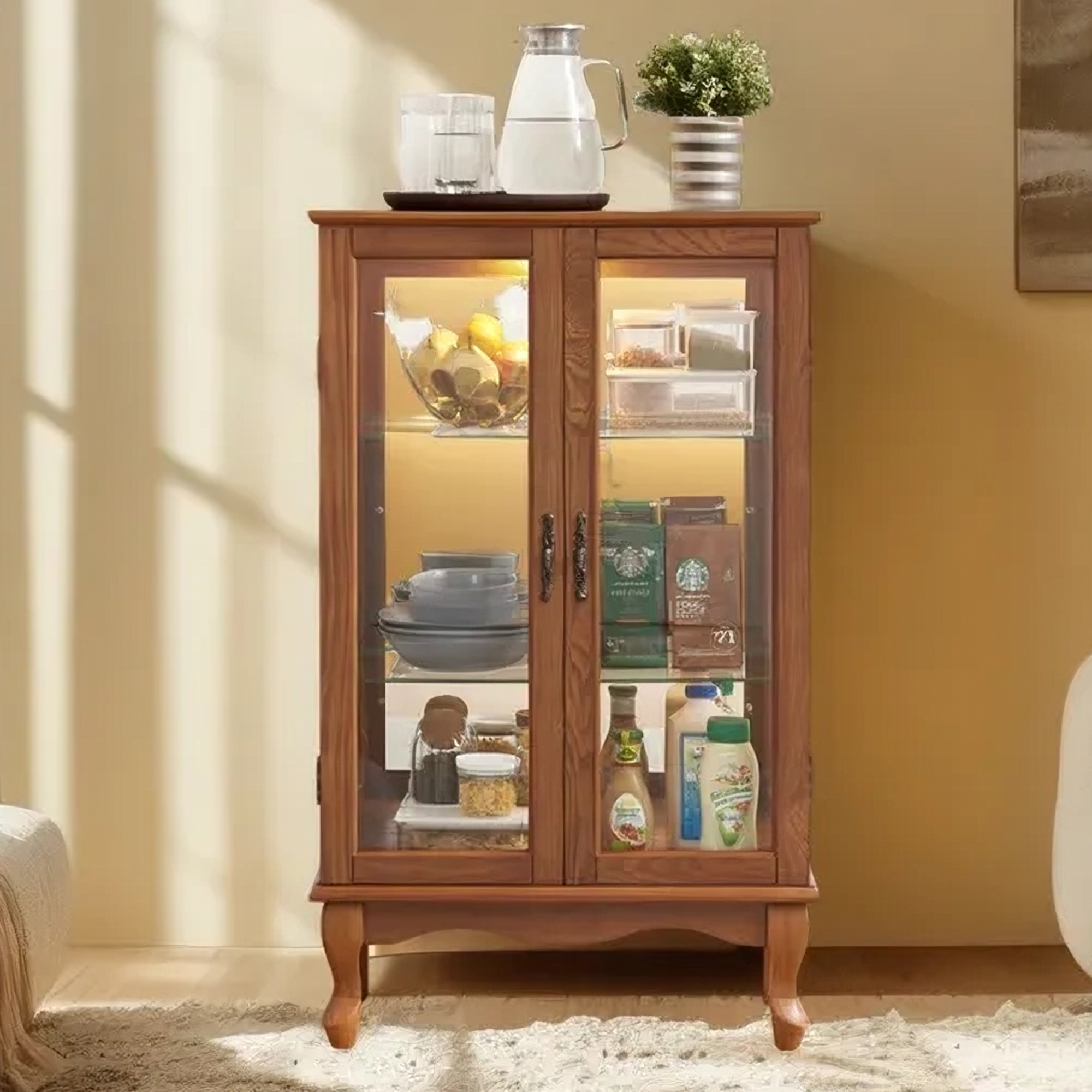 - Elegant Design: Boasts two glass doors with vintage metal handles, adding a classic and decorative touch to any room.