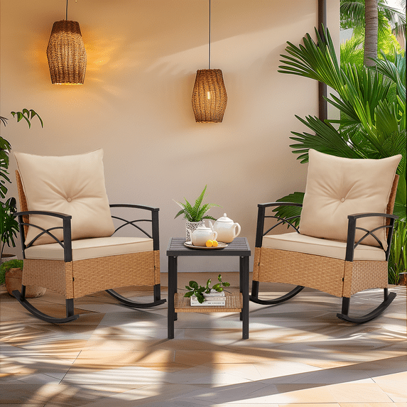 Hero image 0 of MELLCOM 3-Piece Patio Furniture Set, Outdoor Rocking Chair with Thick Cushions and 2-Tier Coffee Table, Wicker Rocker Bistro Set for Porch Deck Garden Poolside, Beige, 0 of 9