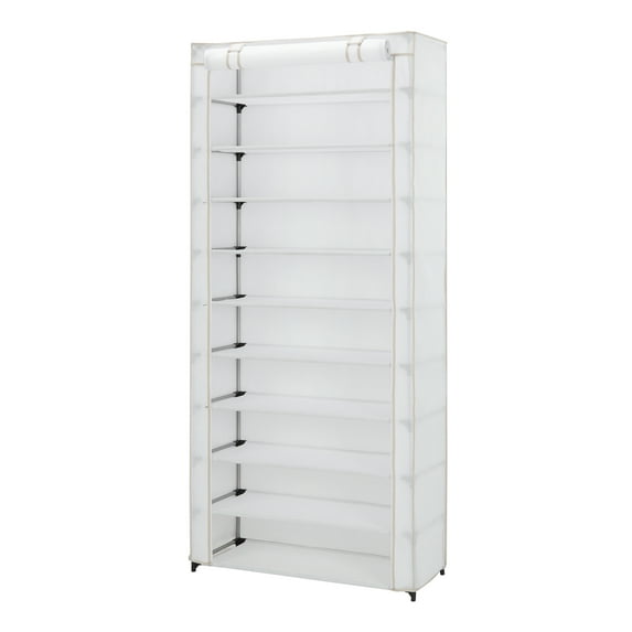 Hero image 0 of Mainstays 10 Shelf Organizer Shoe Rack with Cover to Hold 30 Pair Shoes, 31.5 in W x 13.46 in D x 69.09 in H, White, 0 of 7