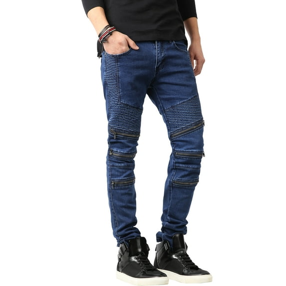 Ma Croix Mens Biker Jeans Distressed Ripped Zipper Straight Slim Fit Stretch Denim Pants