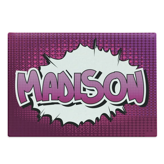 Madison Name Cutting Board, Female in Feminine Colors for Girls Birthday Celebration Cartoon, Decorative Tempered Glass Cutting and Serving Board, Large Size, Fuchsia White and Pink, by AmbesonneMadison Name Cutting Board Female Feminine Colors Girls Birthday Celebration Cartoon Decorative Tempered Glass Serving Large Size Fuchsia White Pink