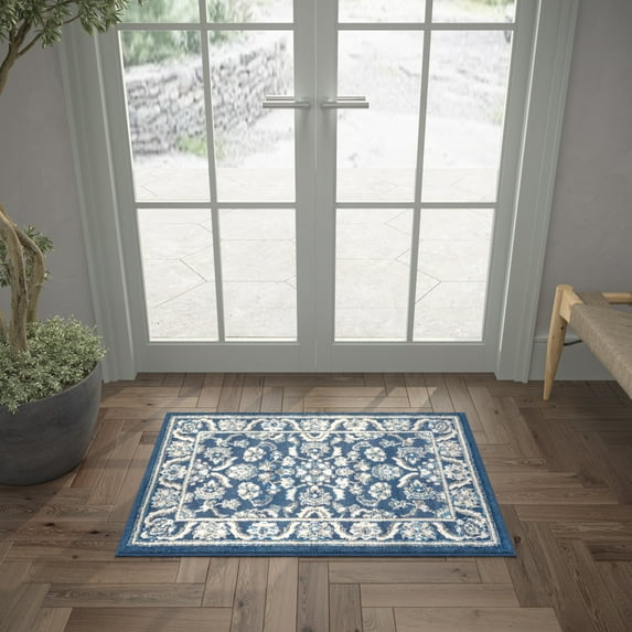 Bountiful floral pattern and substantial border combine in a dazzling traditional area rug. Vibrantly colored with a selectively chosen palette to keep up with today's trends. Great for a living room, dining room, dorm, or bedroom, but can be used in any indoor space. Traditional 2x3 Area Rug (2' x 3') Floral Dark Blue Indoor Scatter Easy to Clean. Good fit for entryway, foyer, entrance, doorway. Vacuum on medium pile setting to remove debris taking care to avoid fraying the edges. Spot clean with water, do not bleach. Rotate periodically to extend the life of your investment.