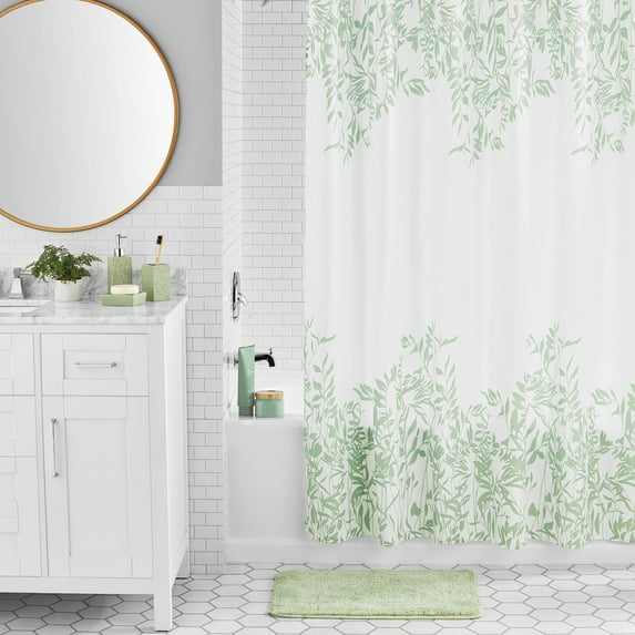 Mainstays 17-Piece Floral Polyester/Ceramic Shower Curtain & Bathroom Accessory Set, Green & White