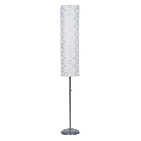 Add soft illumination and style to your room decor with the Mainstays 54" rice paper shade floor lamp. The silver metal stick base is topped with a white textured paper shade featuring a trendy metallic silver lattice pattern. The long shade distributes subtle lighting to create a warm atmosphere in your living space. This neutral-colored floor lamp features a decorative pull chain on/off switch and includes one 9-watt LED bulb. The compact lamp is ideal for adding a subtle pop of contemporary decorating flair to your bedroom, dorm room, office, or apartment. Set it by your chair or in the corner of your room to brighten and decorate your favorite cozy spot. 1-year limited warranty included.
