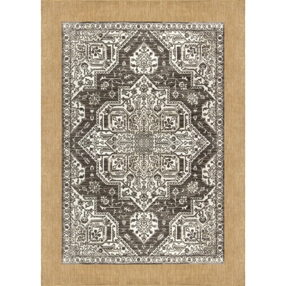 Anyone can create a designer layered indoor area rug look in one rug! It will always maintain the layered style without the worries of a top layer moving out of place. The Mainstays Beige Persian Faux Layered Indoor Area Rug will add a bold and vibrant feeling to your room. The combination of the dark brown medallion and detailed motifs in the field and border will really make a statement in any interior. The perfect finishing touch for your space, this rug will add style and eye-catching appeal with warm neutral tones that are easily matched to throw pillows and other accessories. The neutral toned sisal-look border creates a dimensional effect that is incredible! This rug is sure to be a trend-right showstopper in any home. Multiple yarns add dimensional look and texture to any room. Creates designer look of layered rugs with only one rug. Time-honored styles add the vintage beauty and texture of a textile to the home. Easy to clean, simply vacuum to remove dirt and debris. Use of a rug pad is recommended.
