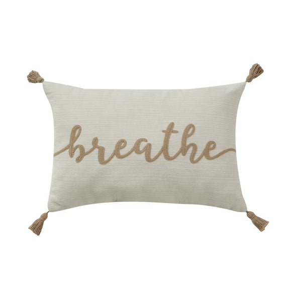 Add a little mindfulness to your everyday routine with the Mainstays Breathe Taupe Embroidered Oblong Decorative Pillow. A cozy decorative accent for any room, this brown, beige, and taupe throw pillow features the word “breathe” embroidered in script letters on woven fabric with a heathered design. The throw pillow also has decorative tassels on each corner for added flair. The oblong decorative pillow measures 12 x 18 inches and is generously filled for supreme comfort. You can easily keep this decorative pillow looking fresh by periodically spot cleaning it gently with a damp cloth as needed.