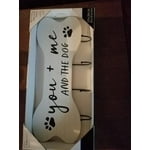 - Pet Wall Plaque: This wood and metal pet wall plaque is designed in the shape of a bone with paw prints and the phrase "you + me and the dog".