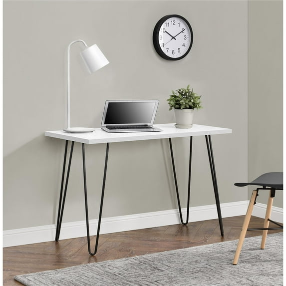Create work from home space in small and medium-sized rooms with the Ameriwood Home Owen Retro Computer Desk. Make the most of this piece's versatility by using it as a desk, vanity or console table in the office, den, or living room. Able to support up to 100 lbs., it's great for holding your laptop, important paperwork, desk lamp and family photos. The white finish coupled with the black metal hairpin-style legs adds an updated, modern look. The Desk ships flat to your door and minimal assembly is required. Simply attach the 4 legs to start using your Desk. Once assembled, the Desk measures to be 26"H x 40"W x 19.5"D.