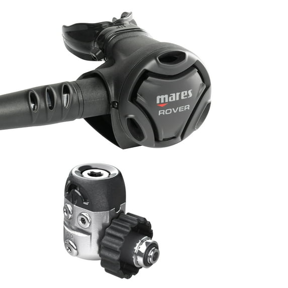 Lightweight and reliability is what the Mares Rover 15X Regulator provides for the diver, with the regulator weighing only 32.9 oz. (933 g) with the hose. Reliability does not mean lack of high performance with the combination of the Mares 15X 1'st-stage and the Rover 2'nd stage. The sandblasted chrome plated marine brass first stage regulator is a balanced diaphragm design which is inherently environmentally sealed. The diaphragm membrane transmits the pressure changes to the internal mechanism eliminating the need for the surrounding water to enter the intricate mechanism. The benefit of this type of first stage design is that none of the internal parts are exposed to contaminants such as salt, sand, chlorine, or pool acids. These environmental contaminants cause corrosion and mineral deposits to form on the internal mechanism deteriorating regulator performance. The Instinct 15X uses A.C.T. Advanced Coating Technology. This patented technology created to optimize performance, safety, and reliability. The valve is covered with a hard Polyurethane (PU) and the sealing surface is a layered with a soft PU for a perfect seal. Tri-material (brass, soft PU, and "heavy-duty" PU) reaches new levels of durability. The new valve is 600% more durable than its predecessor. Another unique feature of the first stage is the dynamic flow control (DFC). The DFC system minimizes the intermediate pressure drop during inhalation. The 15X first stage guarantees a stable flow of air, even under extreme conditions. The first stage is equipped with 4 LP ports with 3/8" and 2 HP 7/16" ports for attachment of a pressure gauge or air integrated console. The techno-polymer second stage has superior performance. All Mares second stages are a reliable downstream valve design and offer the unique patented Vortex Assisted Design (VAD) system.