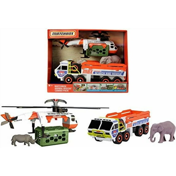 The Matchbox Animal Rescue Vehicles Combo Pack is an exciting animal rescue playset for kids who care about wild animals. Two awesome push-along rescue vehicles with animal figures let young explorers save animals by land and by air. The rhino rescue helicopter includes a detachable crate to load and carry the included rhino figure to safety. The elephant truck includes an elephant-ready loading ramp and fold up sides to keep the animal secure and comes with the elephant figure. A working horn adds to the excitement. This combo pack is a great rescue set for adventurers who love animals and want to come to the rescue and protect wild creatures all around the world.