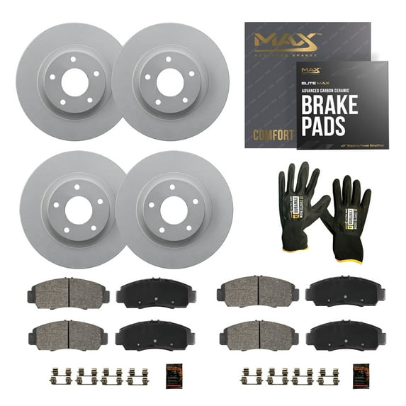 This replacement pads and rotors kit comes with Geomet zinc coated disc brake rotors that offer durability and maximum protection against rust and corrosion. Paired with our EliteMAX carbon ceramic brake pads with hardware to deliver smooth, no noise, and low dust braking.