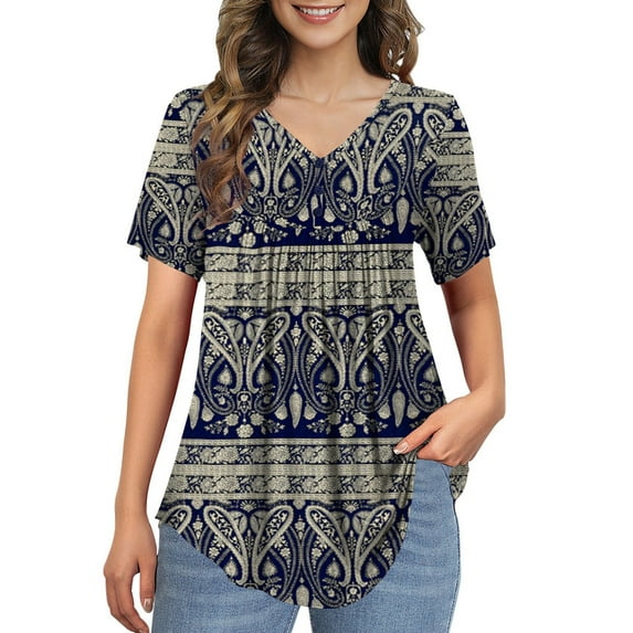McVanedy Women's Pleated Flare Top V Neck Button Plus Size Short Sleeve Top M-4XL