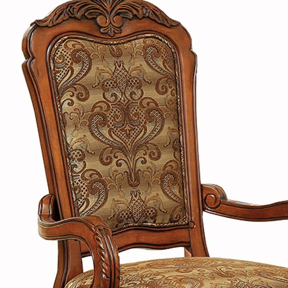 With a stunning appearance and eye catching design, this arm chair is a perfect addition to any traditional or formal dining room. Finely crafted form solid wood, veneers and composites, this chair sports an antique oak finish that delivers a sense of warmth for a grand dining area. Ornate detailing along the back, arms and front legs along with lion claw feet adds to to its classic appeal. The seat and back are upholstered in a gorgeous pattern fabric upholstery.