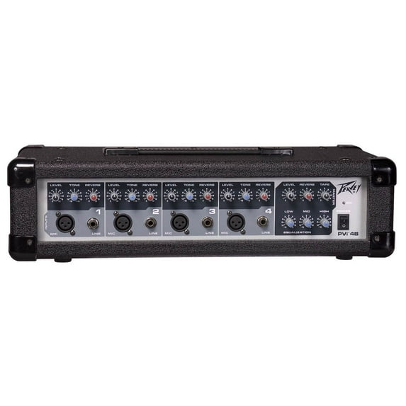- Mixer features rotary controls, built-in power amp, 4 microphone and 0.25-inch TRS inputs, tape/ CD input with level control, line out for connection to external amps, and record output