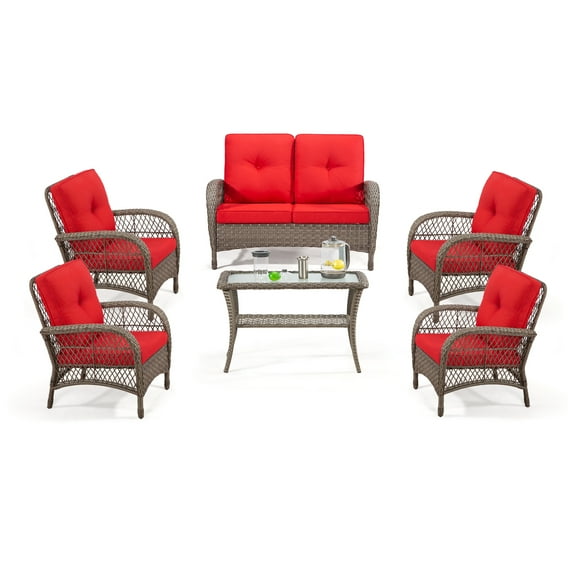Meetleisure 6 Piece Rattan Sofa Seating Group with Cushions,Including 4 Chairs,1 Sofa,1 Table,Red