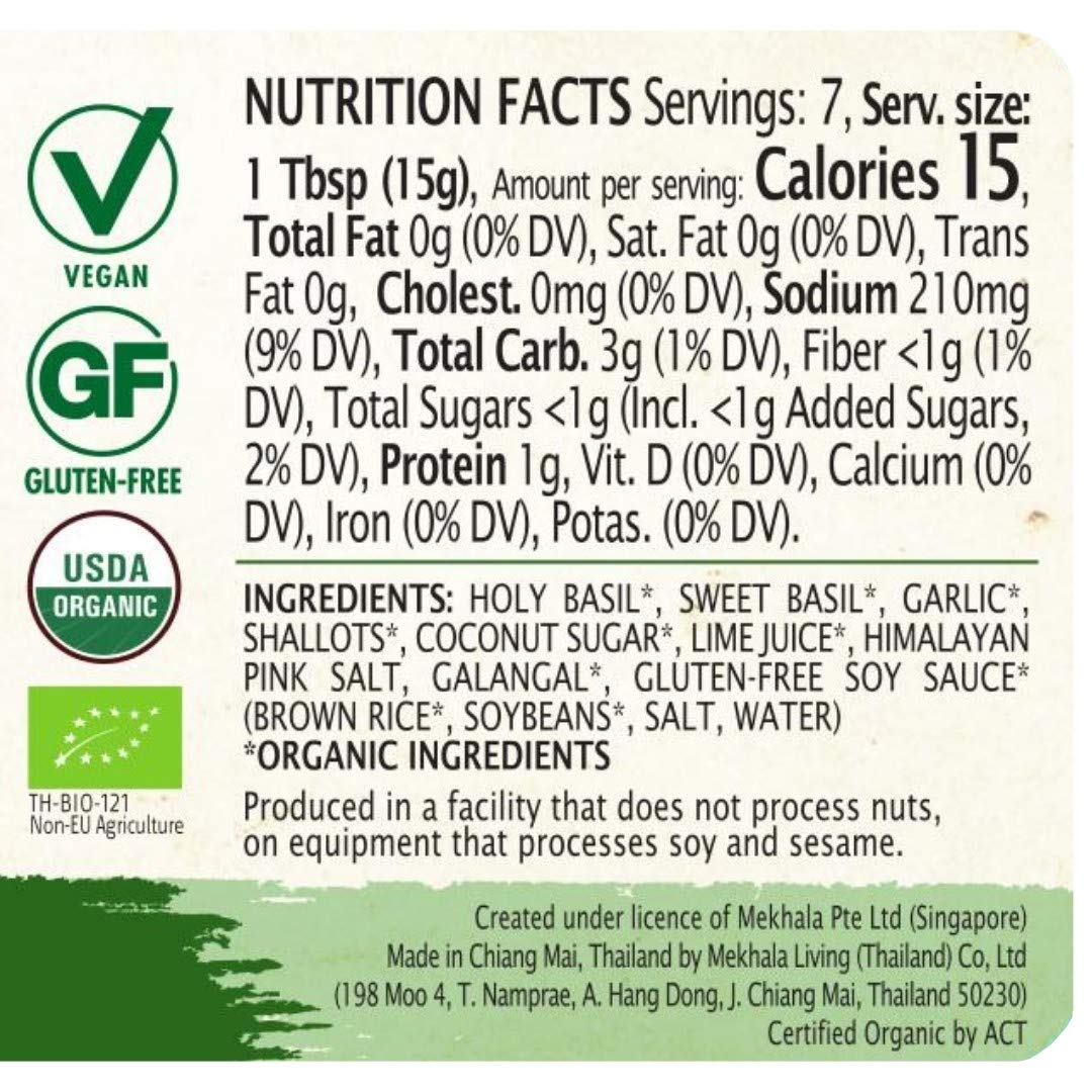 - Holy Basil*, Sweet Basil*, Garlic*, Shallots*, Coconut Sugar*, Lime Juice*, Himalayan Pink Salt, Galangal*, Gluten-Free Soy Sauce* (Brown Rice*, Soybeans*, Salt, Water) *Organic ingredients
