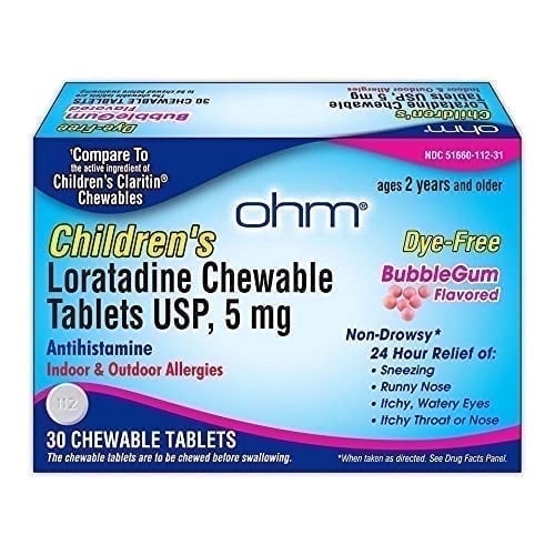 3154.7 out of 5 Stars. 315 reviewsOhm Children's Allergy Medicine, Loratadine 5mg, Chewable Tablets (30 Count) Grape Flavor, Non-Drowsy Antihistamine, 24-Hour Allergy Relief for Runny Nose, Watery Eyes, Itchy Throat & Nose $9.99