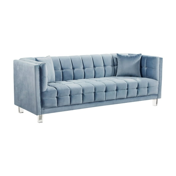 Design a glamorous living room with the Meridian Furniture Inc Mariel Tufted Sofa as its centerpiece. This sofa features tall tuxedo arms and clear acrylic legs. Channel button tufting graces padded interior arms, back, and seat, adding comfort while enhancing the elegance of your sofa. It's upholstered in plush velvet and offered in your choice of available colors. For a finishing touch, matching velvet accent pillows are included.