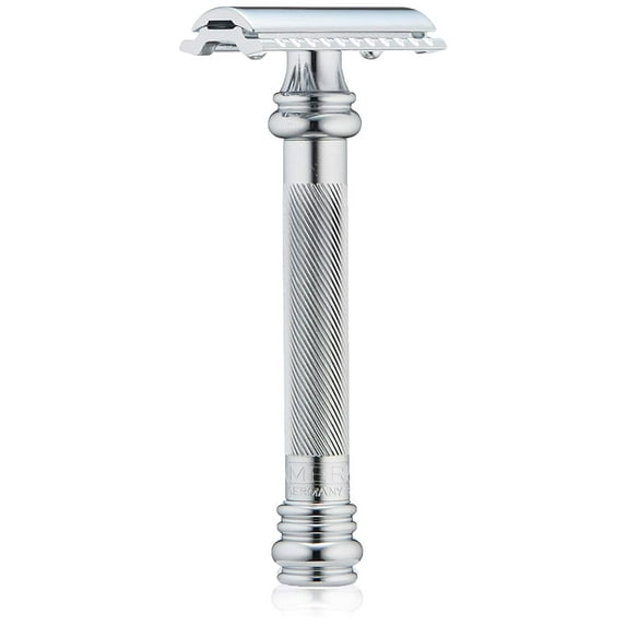 The Merkur Safety Razor has a chrome finish. Its double edge design provides a very close shave. Its handle is shaped like a barber pole. MK 38HD Chrome Plated with Bar. The safety razor has a straight edge especially great for an extra close shave. The Merkur Classic 2-Piece also known as the Heavy Duty is a favorite among wet-shavers. Made in Solingen, Germany with world-famous Solingen steel. This razor will delivery a lifetime of close, irritation free shaves. Upgrading to an authentic Merkur Classic Safety Razor will eliminate ingrown hairs and make shaving a pleasure. Accept no substitutes insist on Merkur.