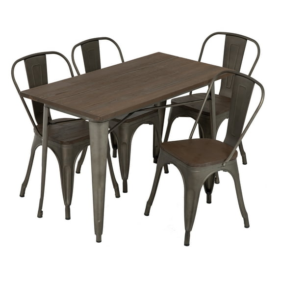 The metal dining table set adds some modern industrial charm to your dining room or kitchen with the AmeriHome Loft rustic gunmetal metal dining table and chairs with wood top. The dark elm wood tabletop gives this standard Height dining table a sophisticated look without being too fussy.