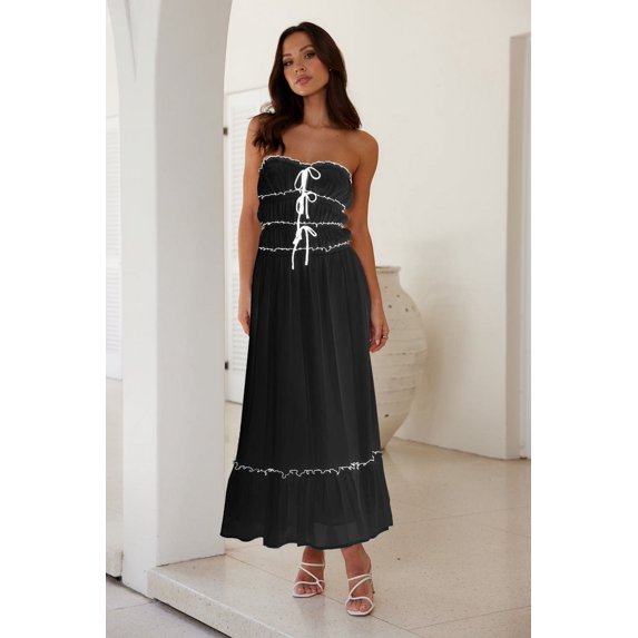 Women Tube Dress Bow Tiered Contrast Color Ruffled Trim Ruched Boat Neck Sleeveless Flowy Long Dresses