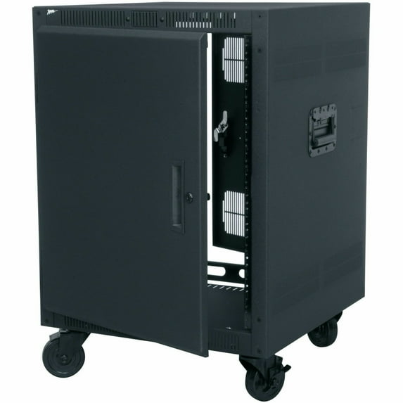 Specify a PTRK series rack when rugged portability is essential. Smooth rolling 4in casters, advanced cable management and secure doors make this rack ideal for serving a variety of applications. Fully welded steel construction for strength. Spring-loaded recessed side handles for rack transport. Key locked front and rear doors standard for security. Side panels are vented for passive thermal management. Rear door accept fans. Slots in bottom of rack for cable strain relief and securing equipment. Standard front adjustable 10-32 threaded rack rail. Includes heavy-duty commercial grade locking casters.