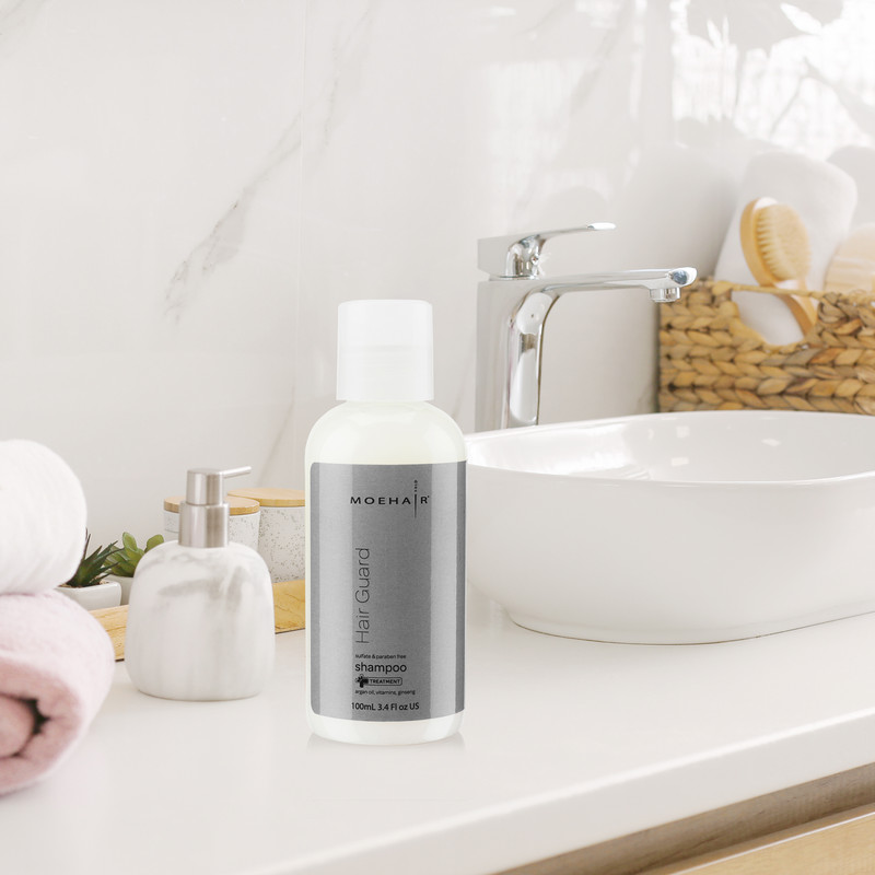 Moehair Travel Hair Guard Shampoo | Stimulates Hair Follicles | Hair Thickening and Volumizing Shampoo | Infused with Argan Oil, Ginseng & Vitamins | Paraben & Sulfate Free, 3.4 Fl Oz