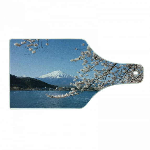 Hero image 0 of Mountain Cutting Board, Japan Heritage Mountain with Lake and Cherry Blossoms Scenery Photo, Decorative Tempered Glass Cutting and Serving Board, in 3 Sizes, by Ambesonne, 0 of 2