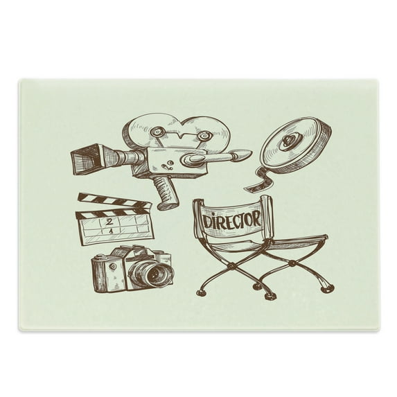 Movie Theater Cutting Board, Photography and Cinema Vintage Set in Sketch Art Style Director Shooting, Decorative Tempered Glass Cutting and Serving Board, Large Size, Beige Brown, by AmbesonneMovie Theater Cutting Board Photography Cinema Vintage Set Sketch Art Style Director Shooting Decorative Tempered Glass Cutting Serving Board Large SMovie Theater Cutting Board Photography Cinema Vintage Set Sketch Art Style Director Shooting Tempered Glass Cutting Serving Board Wine Bottle ShapeMovie Theater Cutting Board Photography Cinema Vintage Set Sketch Art Style Director Shooting Decorative Tempered Glass Serving Small Size Beige Brow
