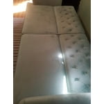 The sofa/futon arrived Monday evening and was taken out of the shipping crate and assembled with help, yesterday. The color and fabric on this futon is quite beautiful and on dull winter days brightens up my living room. it is a handsome piece of furniture, the fabric feeling soft and velvety. It has two large buttoned cushion back rests which will fold flat when being used as a bed. Zips hide the legs which fold down to support these buttoned backs. Six more legs support the item with two legs at each end and two in the middle. This piece of furniture is quite strong and supportive and also very comfortable, either sitting watching T.V. or indeed sleeping which my grandson gave it 100 points when he tried it out last night. it was mid morning today when he finally got up. This item is very well made. The edges of the cushions are rolled in a modern fashion. The workmanship on the buttoned back rest are expertly done. Zips are expertly hidden from view. This item of furniture for me is a top notch design and would suit any home and I am more than happy it is in my home. Like my grandson 100 points for design, quality and comfort. I love this sofa/Futon and can find no faults with it at all.