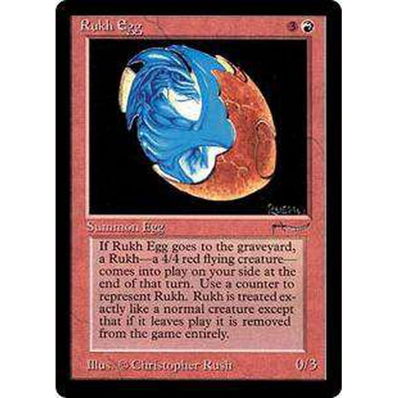 Creature - Bird. 3R. 0/3. When Rukh Egg is put into a graveyard from the battlefield, put a 4/4 red Bird creature token with flying onto the battlefield at the beginning of the next end step.