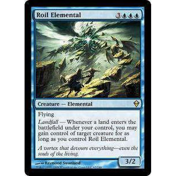 Creature - Elemental. 3UUU. 3/2. Flying. Landfall - Whenever a land enters the battlefield under your control, you may gain control of target creature for as long as you control Roil Elemental.